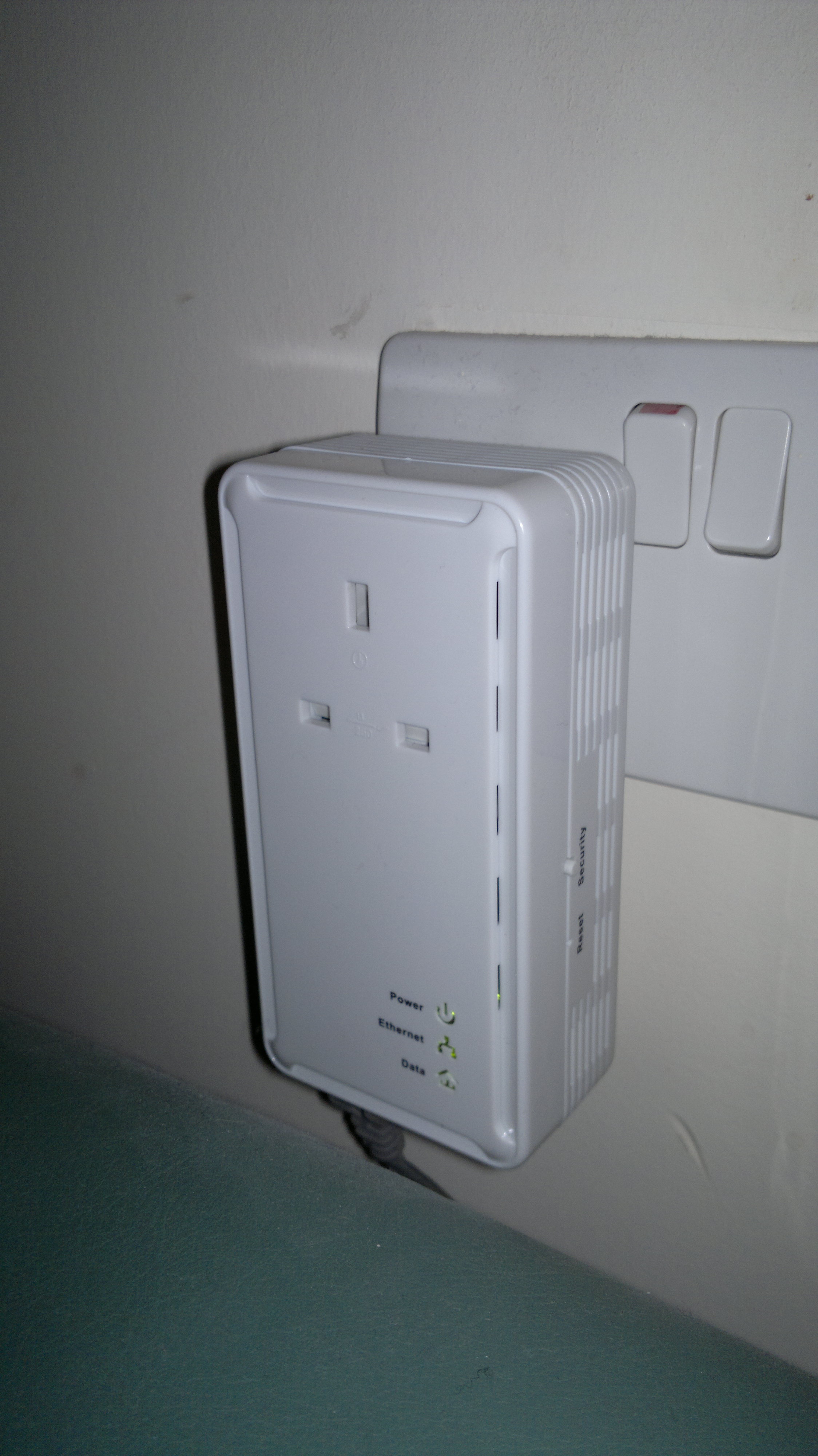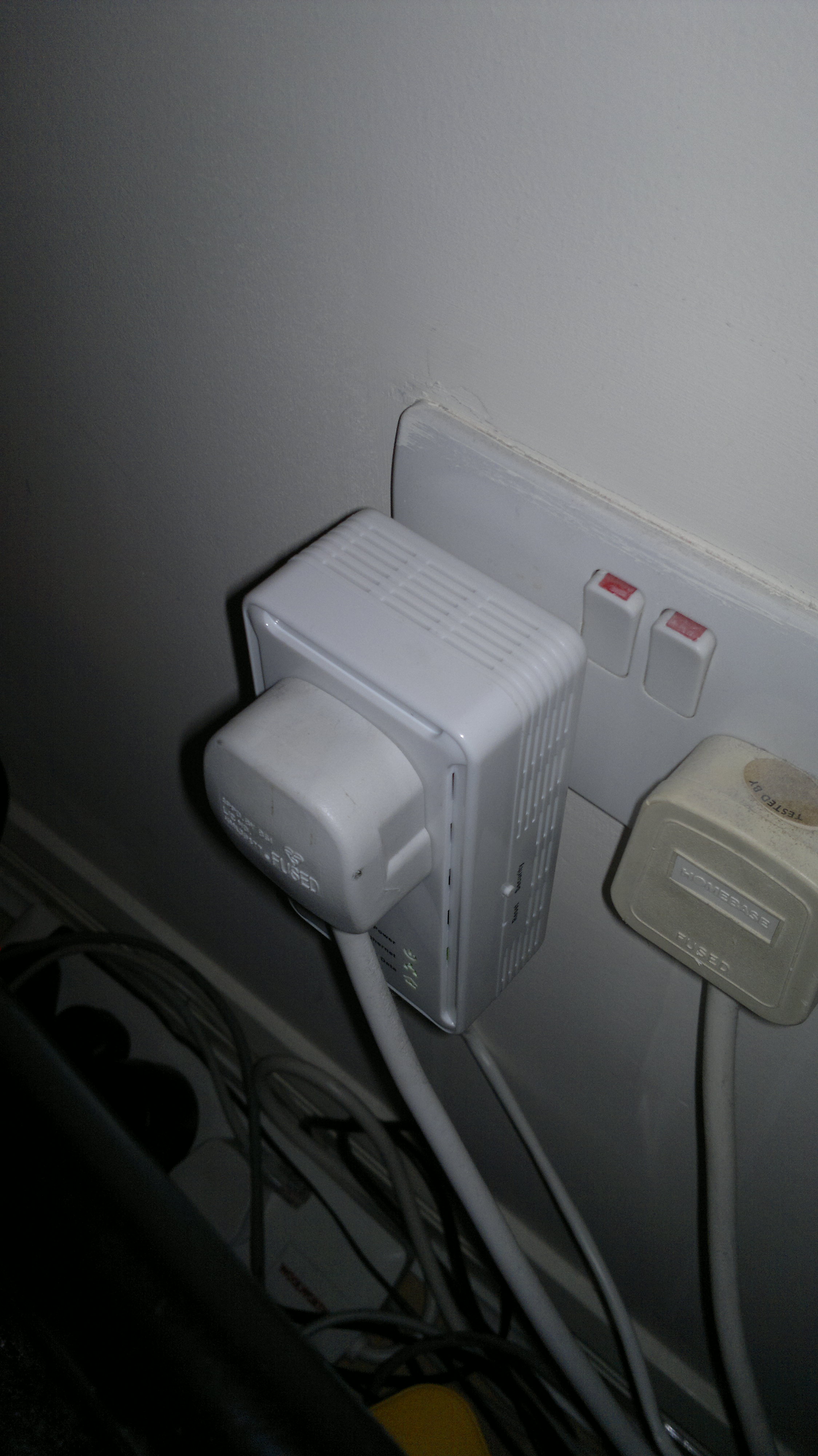 To set the scene: the HomePlugAV adapter was plugged into one of the two wall sockets, and the other contained a Belkin surge protector, powering a four-way “gang socket” with four devices connected (almost all “mains adapters” or “wall-warts”). I had an inking that one or more of these factors was spraying interference into the system, but I couldn’t really turn any of them off.